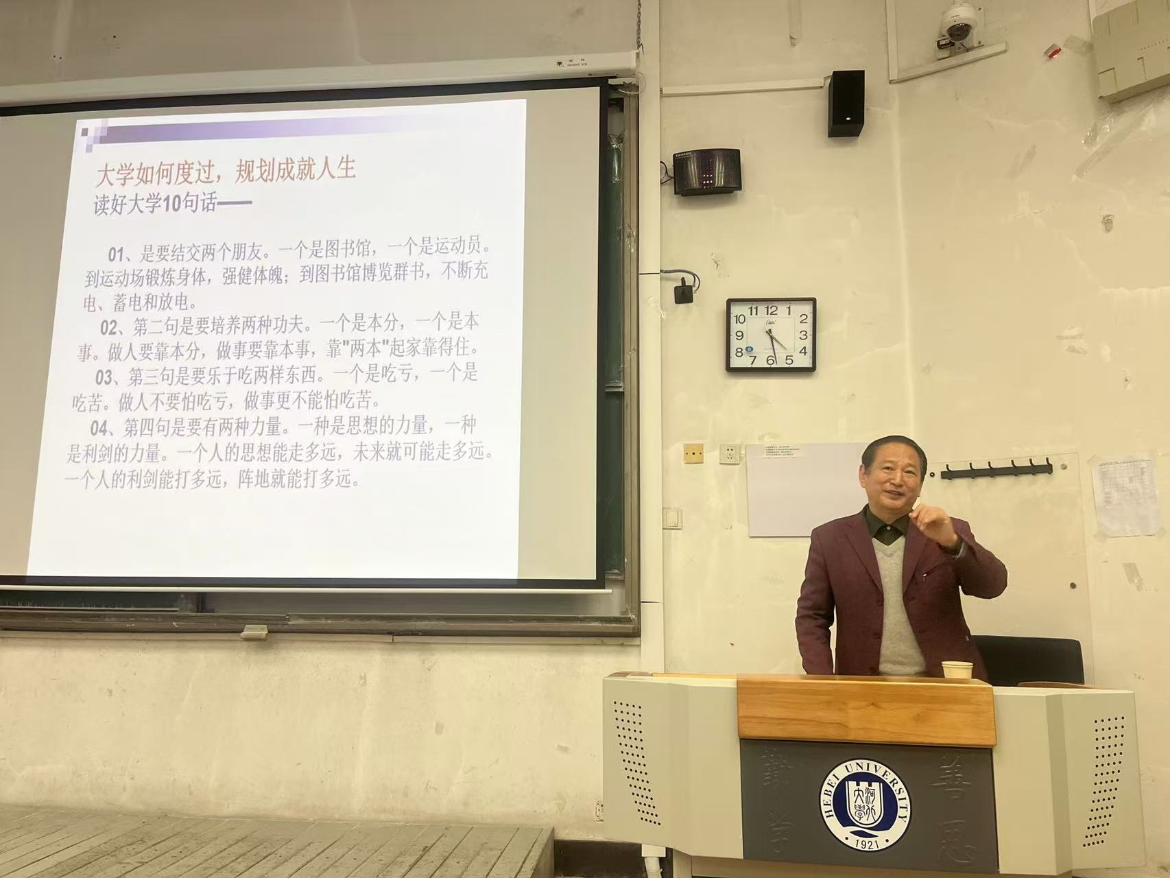 宇文宏教授曾担任河北大学党委委员、学院党委书记等职务,并在两个学院均有工作经历,对母校和母院怀有深厚感情。报告中,宇文教授凭借其深厚的理论素养和生动的语言表达,系统阐释了党的二十届四中全会精神的精髓要义,并紧密结合学生的专业背景,就如何将国家发展战略融入个人学业与生涯规划,进行了深入浅出、细致入微的指导。他殷切寄语全体新生:一要具备长远眼光,与时俱进,敏锐洞察时代发展大势;二要涵养高尚品德,坚守底线,筑牢人生价值根基;三要积累广博学识,知行合一,不断提升能力素质;四要厚植家国情怀,懂得感恩,勇于担当时代责任。他鼓励同学们努力成长为立大志、明大德、成大才、担大任的优秀大学生。