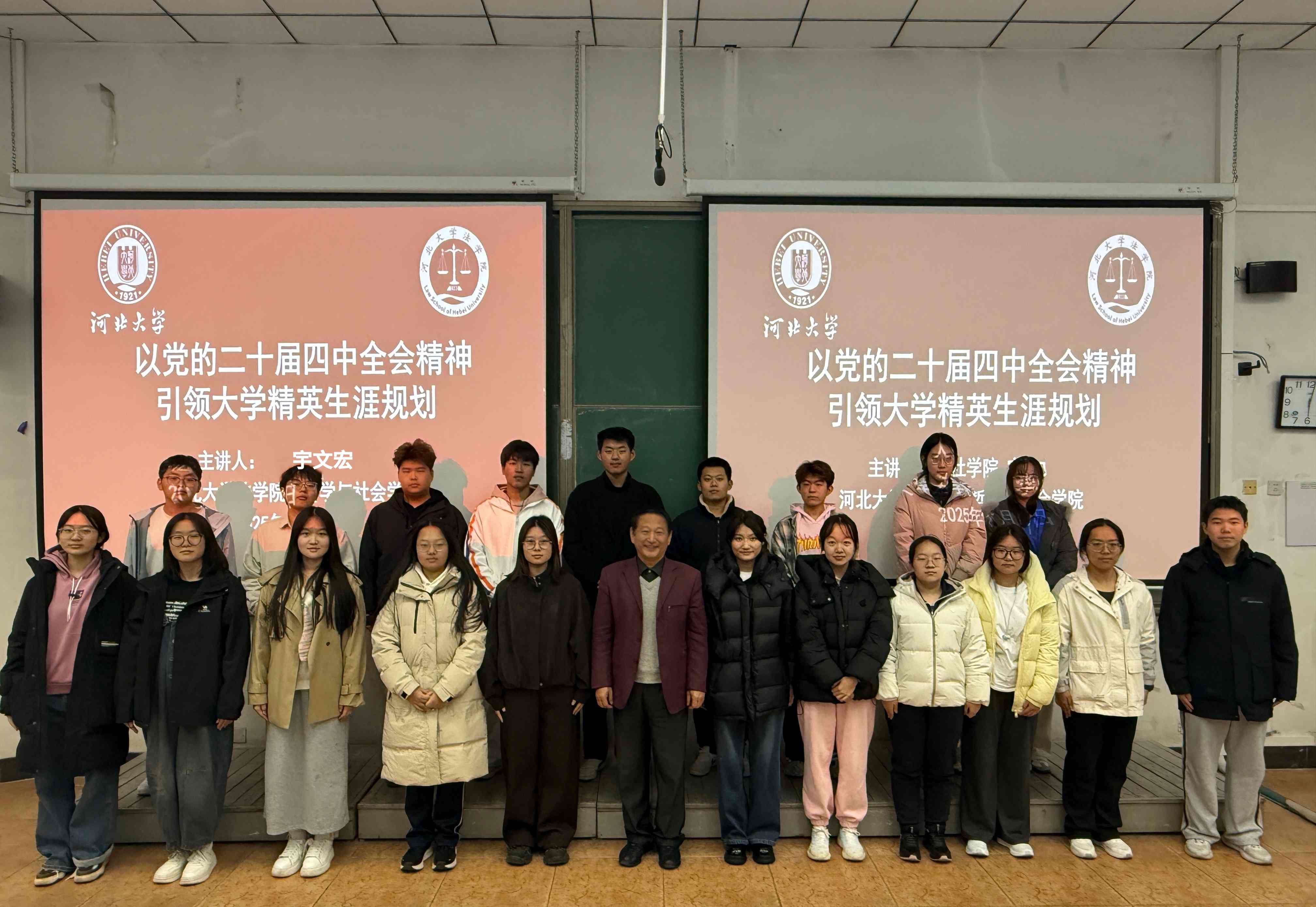 为引导2025级新生积极适应大学生活,迈好人生成长的关键一步,11月13日下午,哲学与社会学学院与法学院在A2二阶报告厅联合举办了主题为“用党的二十届四中全会精神引领大学精英生涯规划”的新生素质提升大讲堂。活动特邀河北大学老教授协会、关心下一代工作委员会常委,河北省思想政治教育研究专家、硕士生导师宇文宏教授作专题报告。两学院辅导员刘怡宏、尹清华、韩明月及2025级全体新生共计260余人参加了活动。讲座由哲学与社会学学院党委副书记王昭主持。