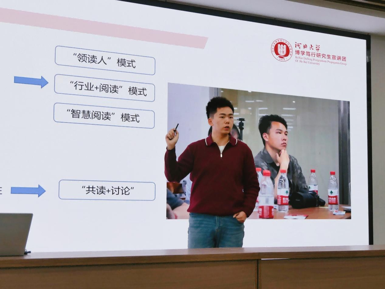 随后,“求是”研究生宣讲团关屹团长介绍了宣讲团的发展历程与特色。这支成立于2024年5月的队伍,已开展200余场主题宣讲,以“青年化阐释+元素化解码”的方式,让党的创新理论、燕赵文脉与校史专业知识变得“有温度、有共鸣”。关屹团长还以《聚焦文化符号,倡导阅读生态》为题,重点分享了“坤舆悦读会”的创新实践。该活动针对当代青年的现实困境,开创“双向激发”对话模式,运用“主题+分题”形式,将卡西尔符号学、巴赫金对话理论融入阅读推广,已成功举办多期并联动保定多所高校,获得广泛关注。