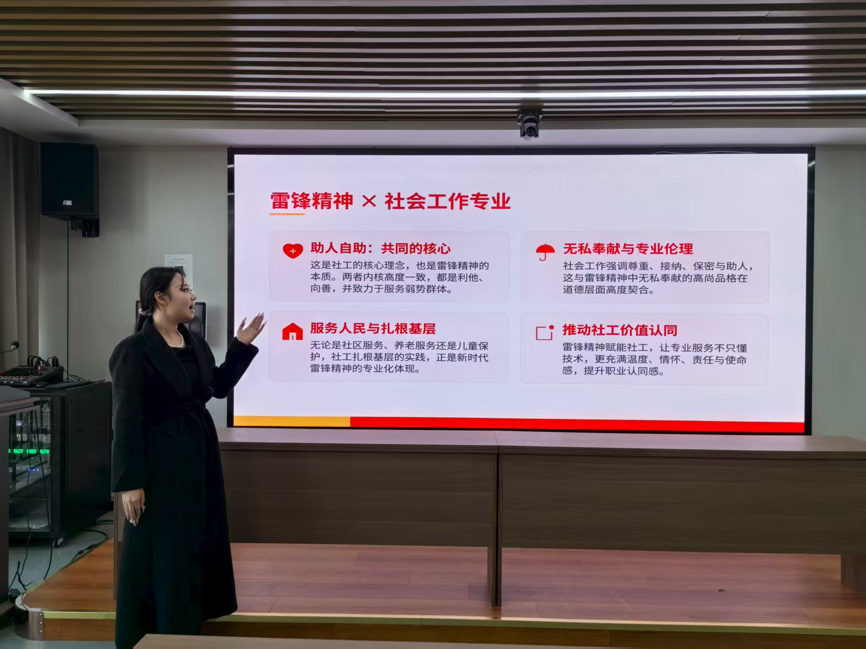 孟子源、何睿研、刘晓静三位同学依次宣讲,分别围绕雷锋精神的内涵、新时代的践行路径以及依托专业服务社会等角度,以青年话语和真挚情感诠释雷锋精神的时代内涵。宣讲团队深情回顾了雷锋同志短暂而光辉的一生,结合雷锋日记,系统阐述了奉献精神、“螺丝钉”精神、“钉子”精神和艰苦奋斗精神在内的雷锋精神核心要义。宣讲结合学院学雷锋实践活动,生动展现了社会工作专业同学的专业担当——他们以“同理心”倾听同窗心声,用“优势视角”点亮个体潜能,将个案、小组等专业方法精准嵌入“一站式”学生社区,让雷锋精神在宿舍楼栋里生根发芽、润物无声。宣讲还从个人、集体、校园文化和社会实践四个层面,向广大同学发出践行雷锋精神、续写新时代雷锋日记的行动倡议。
